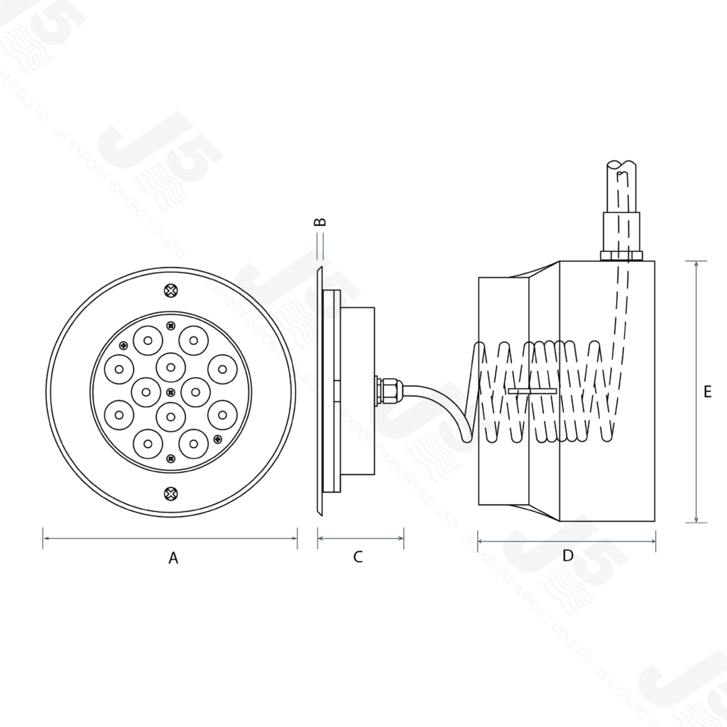 ไฟใต้น้ำ LED สำหรับสระว่ายน้ำ ขนาด 36 วัตต์ ที่มาพร้อมกับขอบสแตนเลส ที่มีความแข็งแรง ทนทาน และมีที่เก็บสายไฟสำหรับติดตั้งเข้าไปพร้อมกับโครงสร้างของสระว่ายน้ำ ด้วยลักษณะของหลอดไฟเป็นแบบ High Power ที่ให้ความสว่างสูงจึงมองเห็นแสงได้ทั่วทั้งสระว่ายน้ำ อีกทั้งยังมีให้เลือกทั้งแบบแสงสีเดียว หรือจะเป็นแบบที่เปลี่ยนสีได้ก็มีเช่นกัน